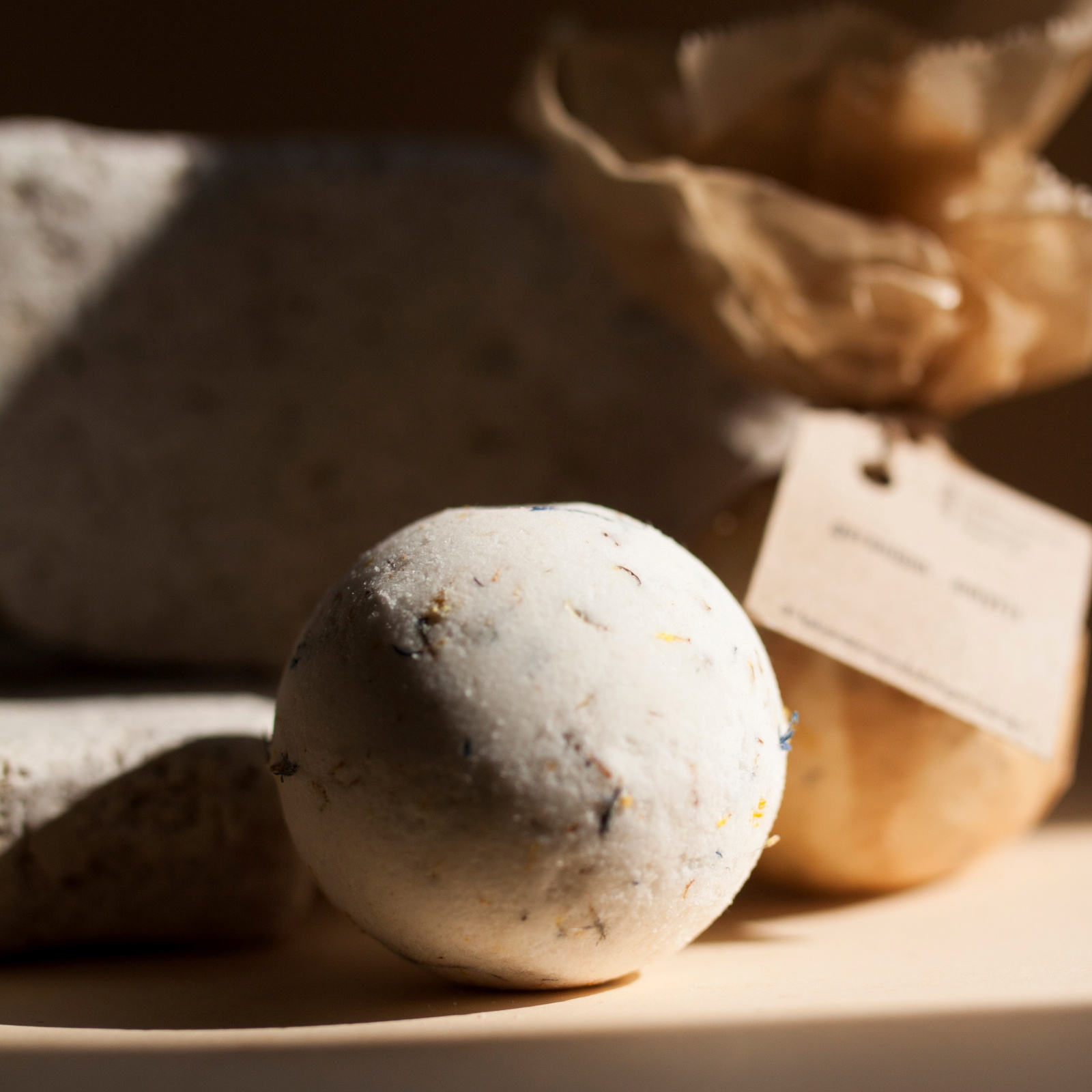 Handmade, full of nourishing ingredients, effervescent bath ball. When dropped into water, it releases nurturing ingredients and owes its fresh, floral-balsamic fragrance to a combination of geranium and amyris essential oils. Petals of marigold, cornflower and blanket flowers, which float on the water after dissolving the ball, will turn your bath into a real ritual, thanks to which you will create your home spa.