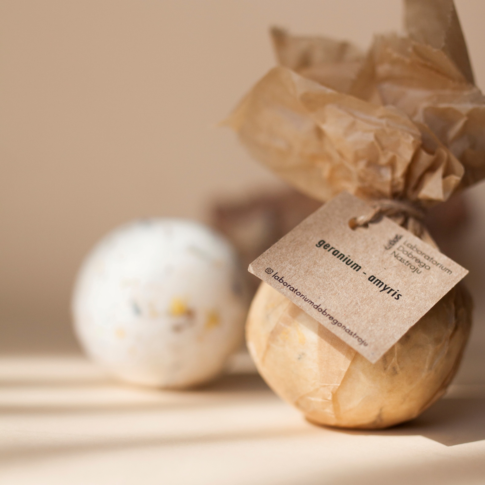 Herbal and floral geranium oil accelerates the cleansing of the body from toxins, has a moisturizing, antiseptic and anti-acne effect. Amyris, on the other hand, which is a West Indian variety of sandalwood, calms, relieves tension, has a moisturizing and antibacterial effect. Bathing with a ball is an ideal way to recover and relax your muscles.