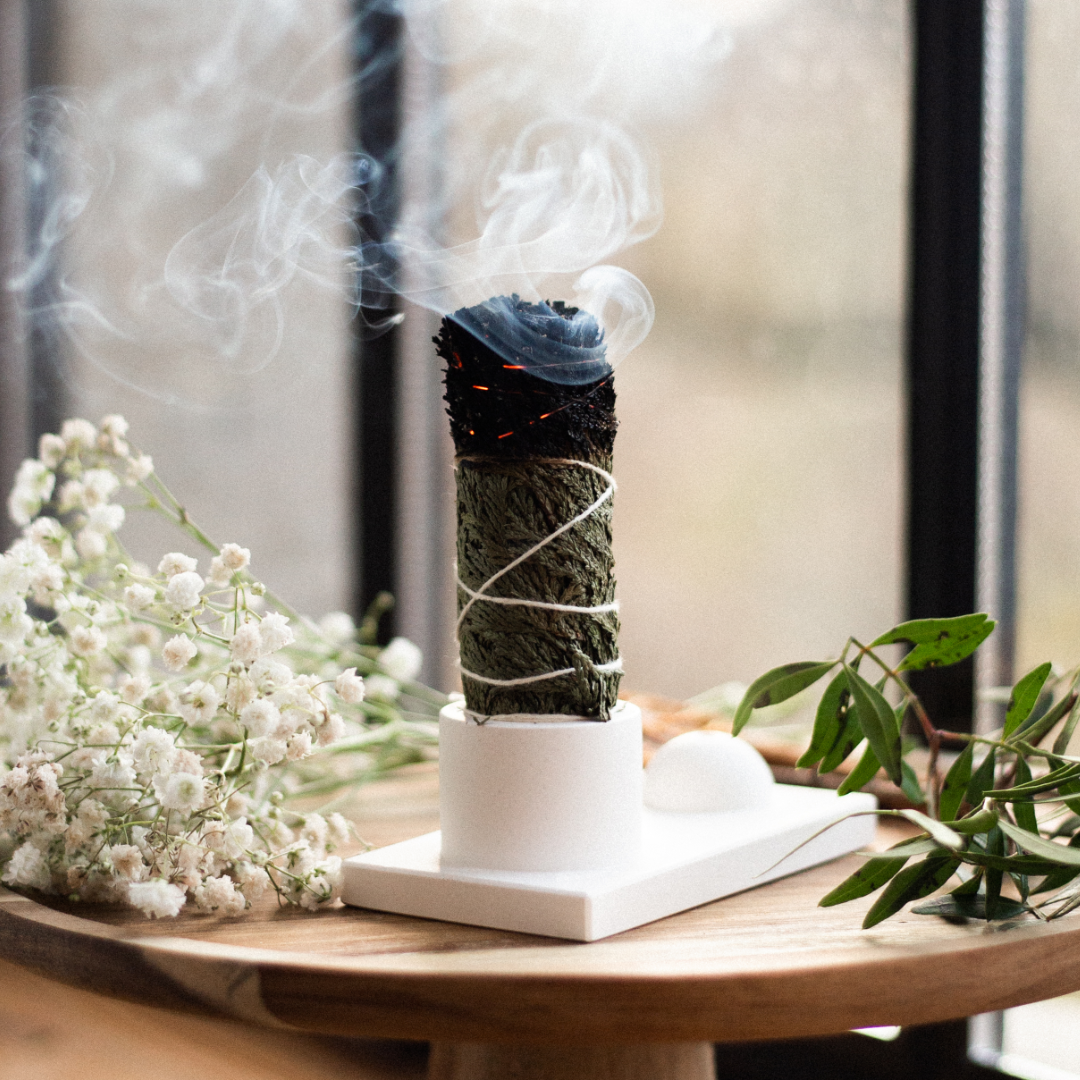 Light the bundle, hold it at a gentle angle, let it flare up, and then blow it off. You can think about the intention of cleansing, direct the smoke to the desired areas or put it in an adapted vessel.