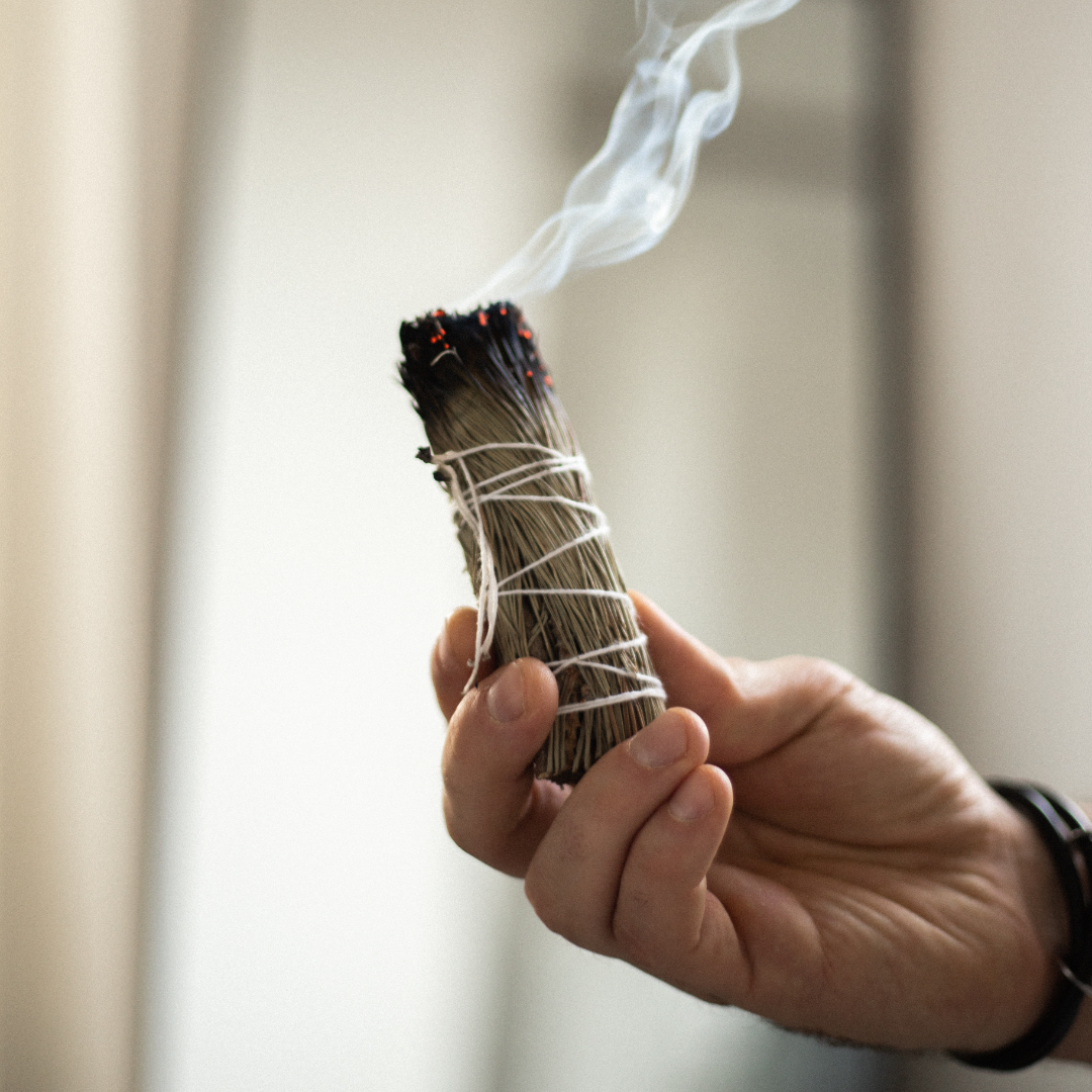 Light the bundle, hold it at a gentle angle, let it flare up, and then blow it off. You can think about the intention of cleansing, direct the smoke to the desired areas or put it in an adapted vessel. Use whenever you feel the need to clear the energy around you or increase your concentration.